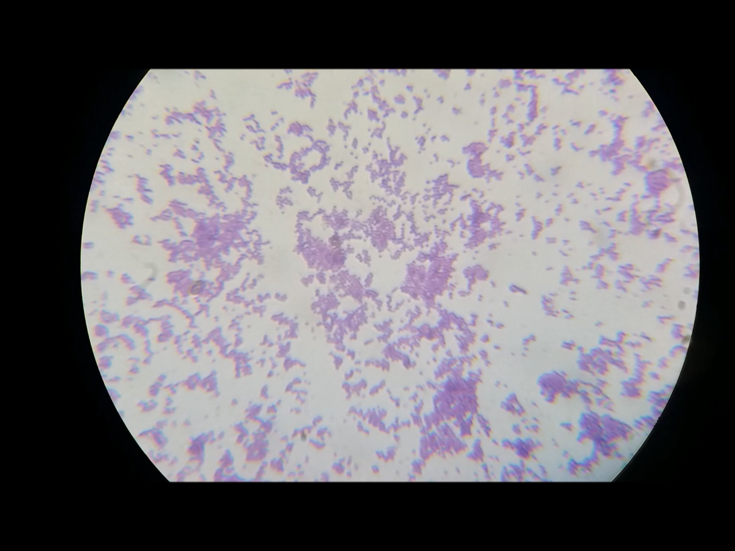600배로 확대한 사진입니다. 사진 속 균은 구균입니다. 정말 작은 균들이라 많이 확대해도 이 정도밖에 안보입니다. 입 속 세균을 고체배지에 키운 후 관찰한 것이라 정확한 균을 특정하긴 어렵고 그람양성균정도로 보입니다.