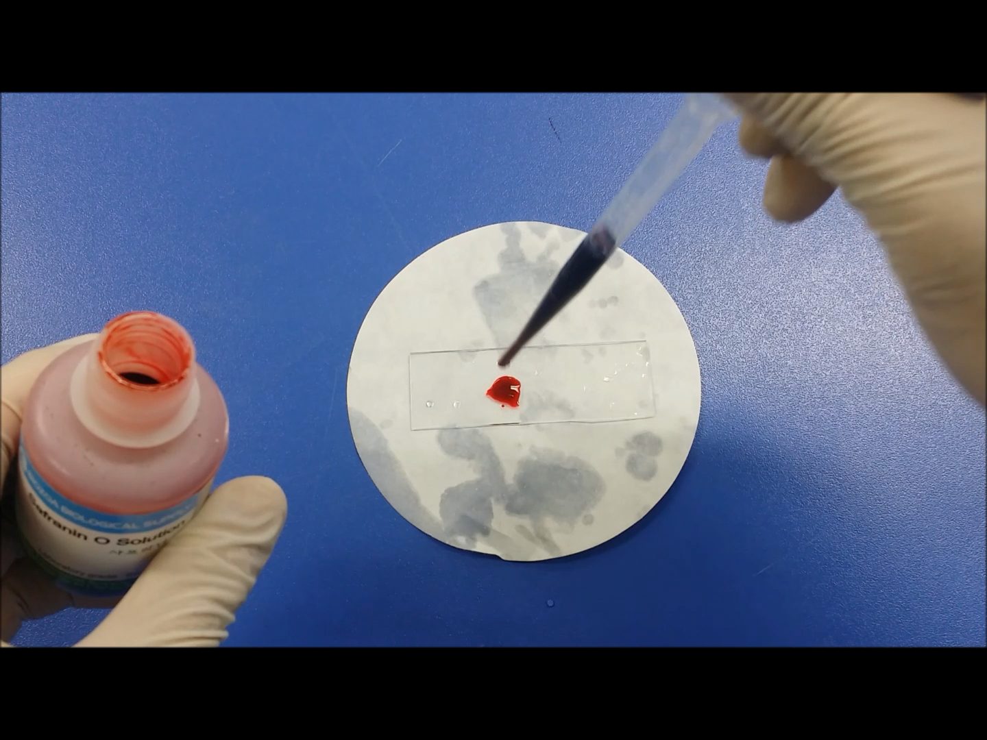 마지막으로 사프라닌 용액을 떨어뜨린 후 2~3분 동안 염색시켜 줍니다.