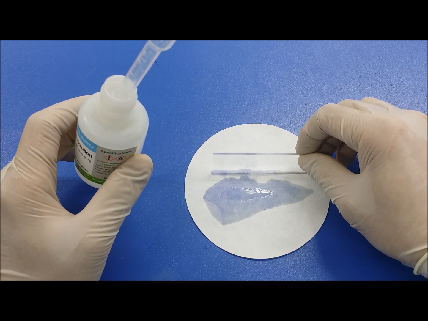 크리스털 바이올렛 염색약을 받침 유리에 고정시킨 세균 위로 떨어뜨린 후 2~3분 정도 염색시켜 줍니다.