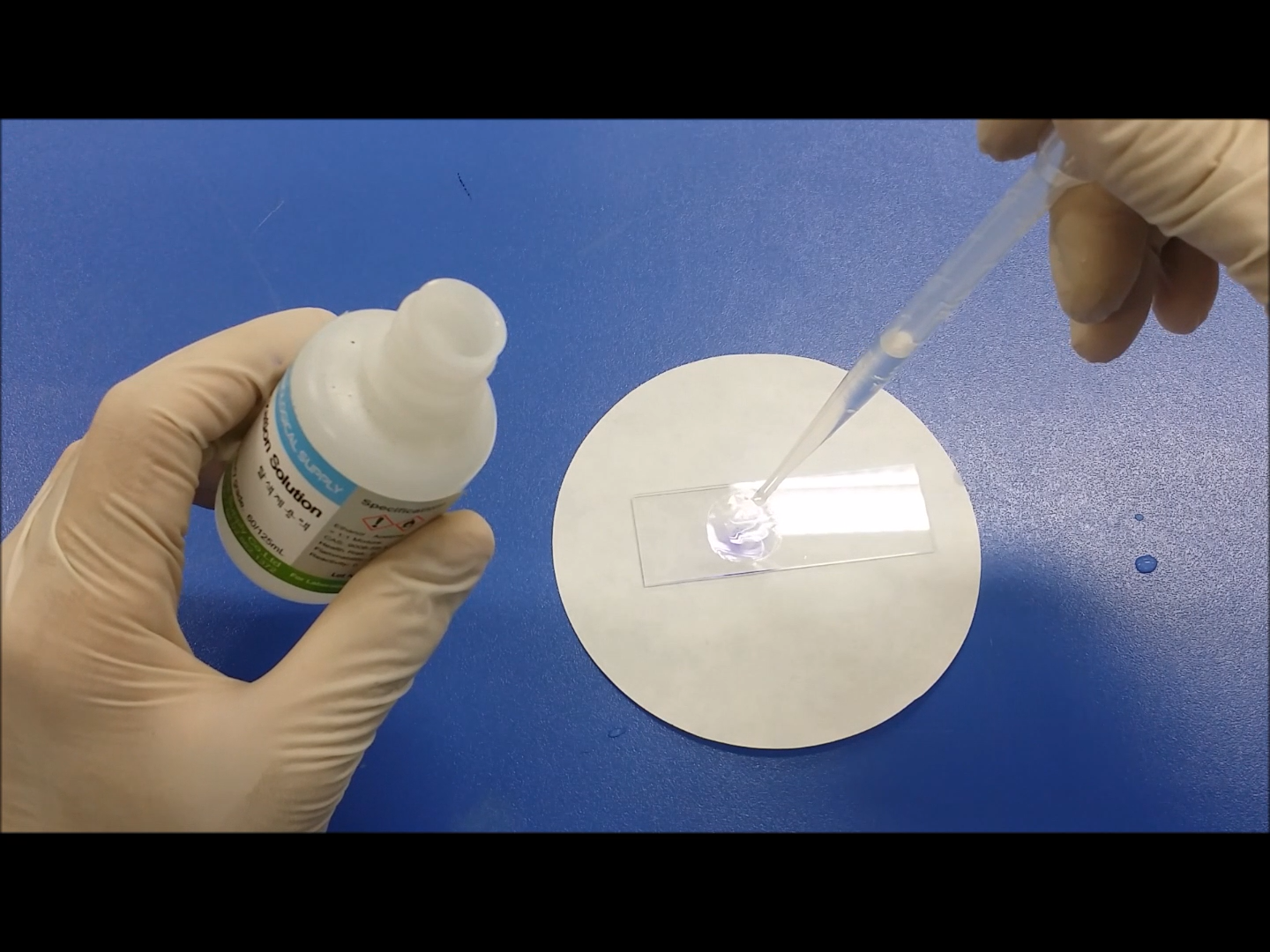 그다음 받침유리에 그람 아이오딘 용액을 떨어뜨려 세균에 염색된 크리스털 바이올렛이 더 강하게 염색되도록 해주세요.