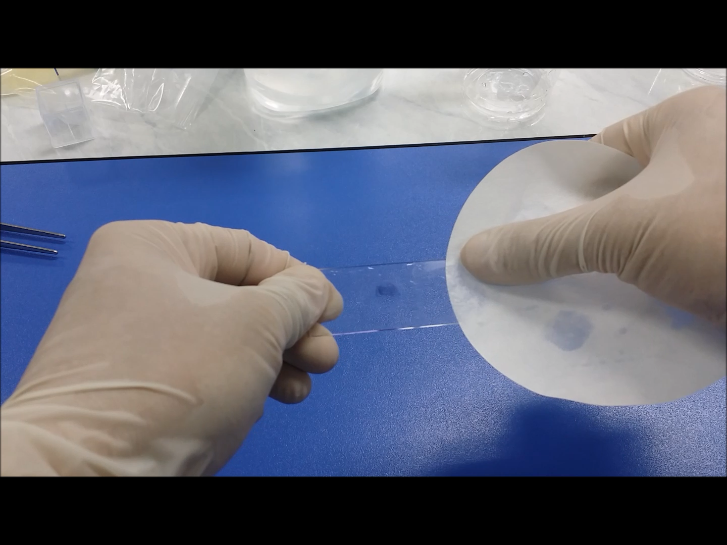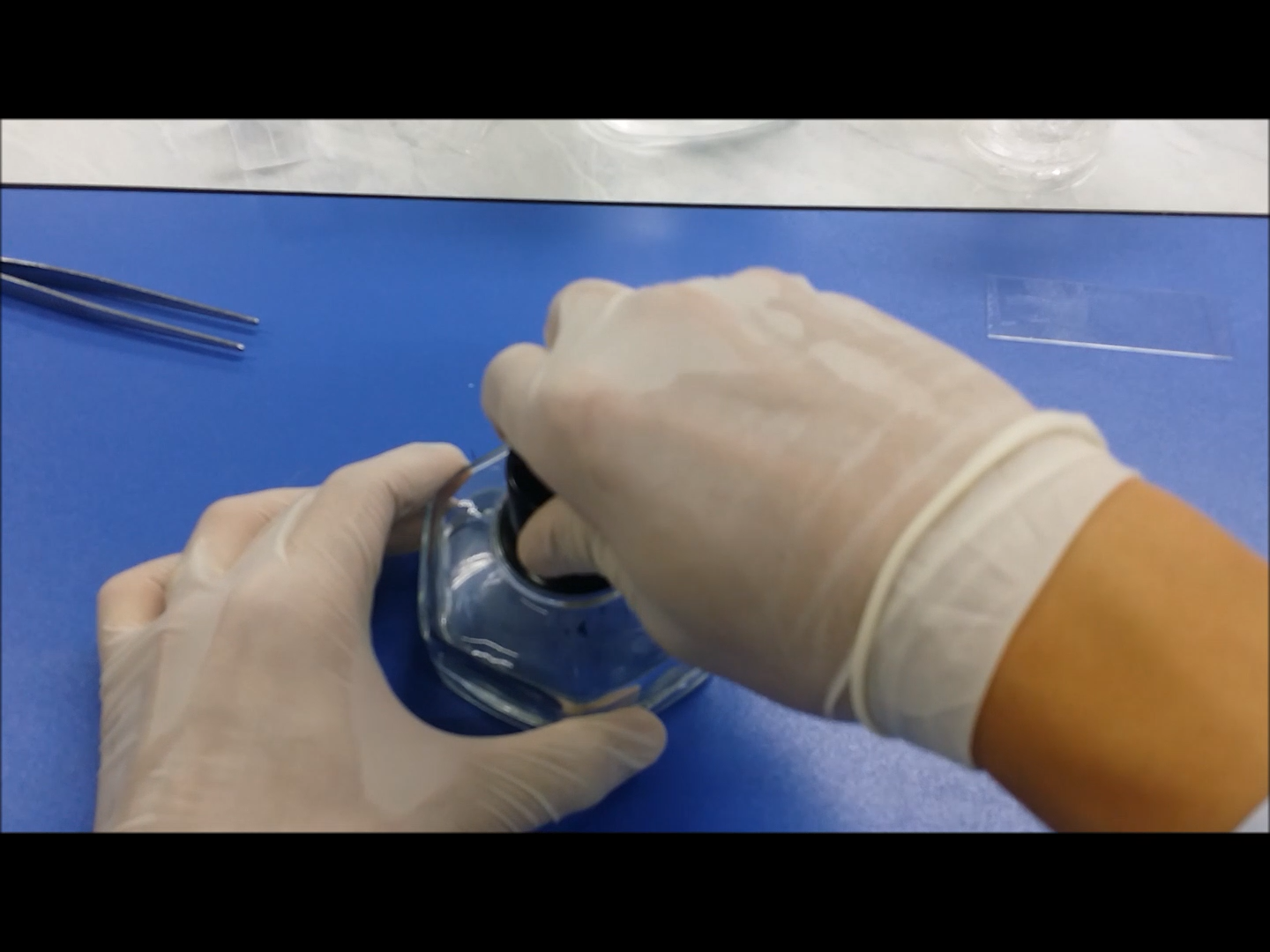 주변 물기를 닦아낸 후 관찰을 실시합니다. 덮개유리를 핀셋을 이용해 덮어주세요. 균이 있는 곳에 물기가 없으면 물방울을 추가로 떨어뜨려도 됩니다.