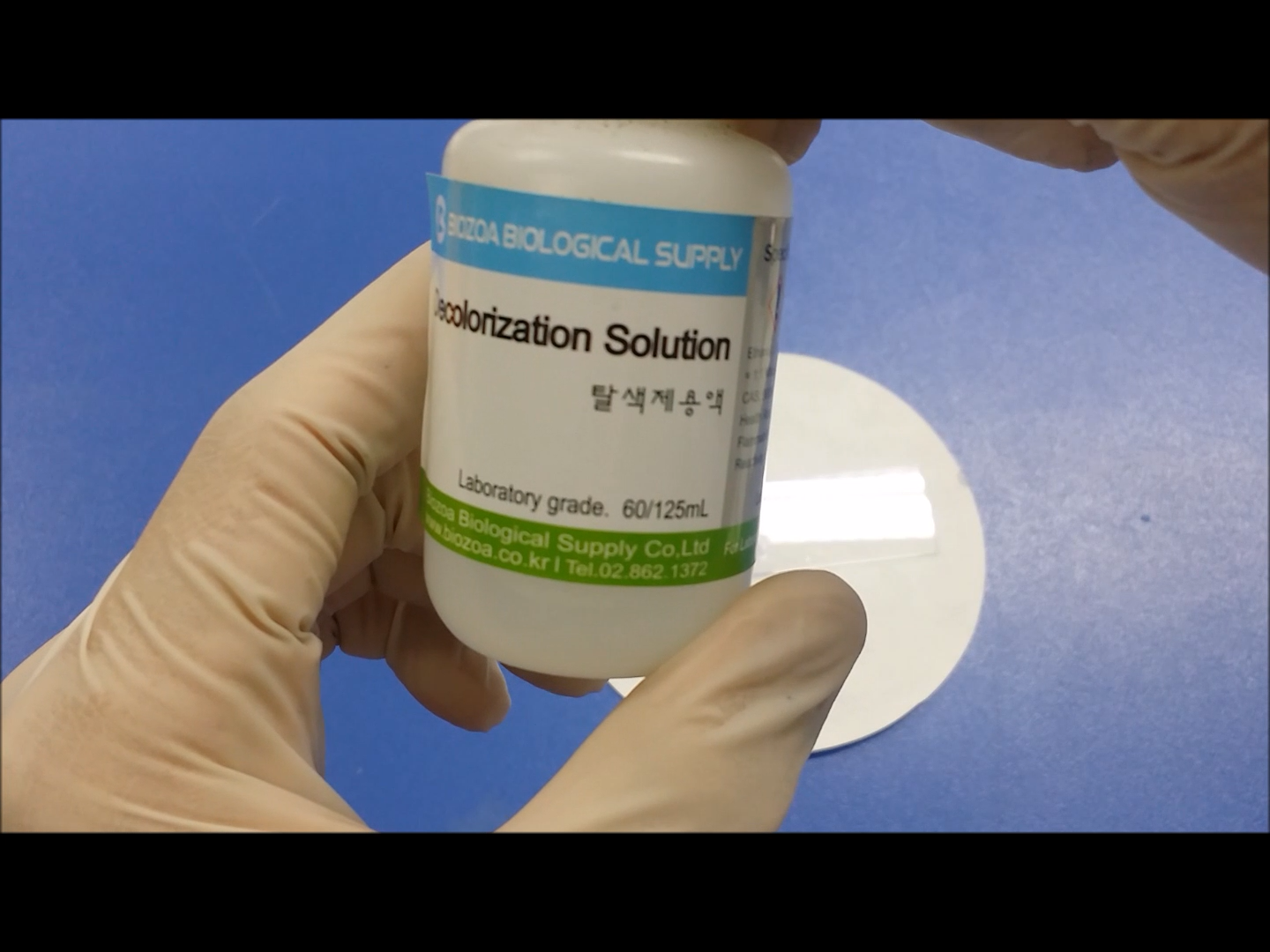 탈색제 용액을 떨어뜨려 크리스털 바이올렛(보라색) 염색약을 탈색시킵니다. 보라색이 없어지도록 탈색해 주세요. 이 과정에서 그람음성균은 보라색이 탈색되고 그람 양성균은 세포벽이 두꺼워 탈색되지 않고 보라색으로 남습니다.